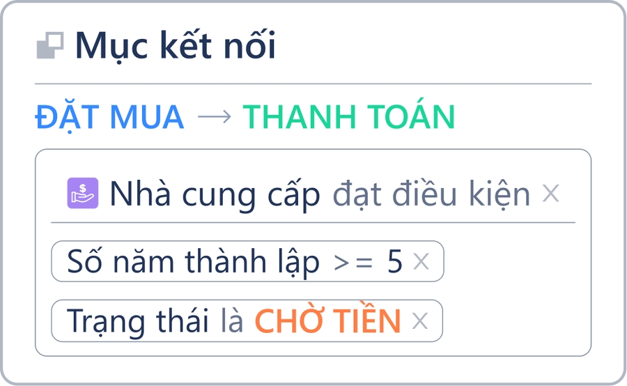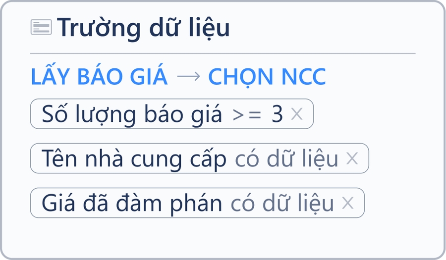 Kết hợp 2 thành phần Tiêu chí lọc và Số mục lọc ở trên, điều kiện mà người dùng cài đặt ở đây có thể hiểu là các mục liên kết phải đáp ứng các yêu cầu: đang ở trạng thái thuộc nhóm hoàn thành, các trường dữ liệu Người đề xuất, Sản phẩm không được để trống và các trường dữ liệu Số lượng đặt, Đơn giá, Thành tiền phải lớn hơn 0. Nếu số lượng các mục liên kết đạt đủ các yêu cầu trên đạt 50% tổng số lượng thì hệ thống sẽ cho phép chuyển trạng thái.