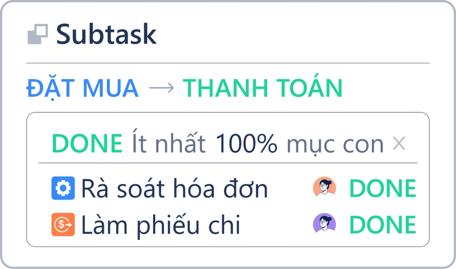 Mục việc con: Đảm bảo các mục việc con của nghiệp vụ đã đạt được các trạng thái, tiêu chí nhất định.