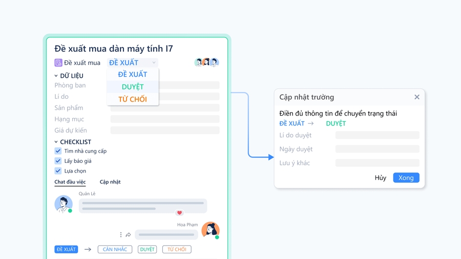 Cập nhật trường: Chọn ra trường dữ liệu đích và cập nhật giá trị theo nguồn đầu vào mong muốn. Ví dụ: Sau khi Đề xuất mua được chuyển sang Lấy báo giá, tự động lấy {Tên sản phẩm}ở phiếu đề xuất gắn vào trường {Tiêu đề} ở Yêu cầu báo giá